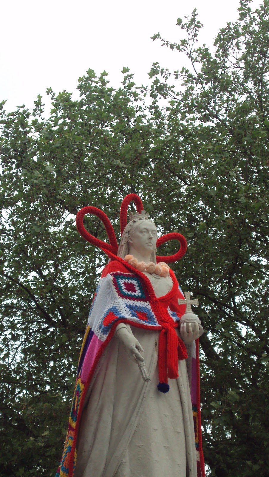 Thanks to our amazing team of knitters...Queen Victoria is now looking pretty colourful on our rainy bank holiday!